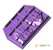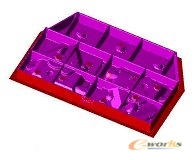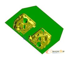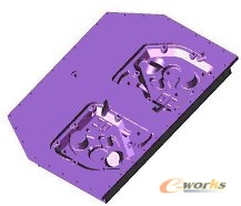 以上模型通过IGES接口从客户文件中转换过来,在CIMATRON_E中利用快速分模Quick split提取模型的正反面,在分模过程中我们发现原客户文件中丢失了一些面同时还存在很多小碎面。而且加工模型需要将数控加工中不加工的孔补上。CIMATRON_E对修复这样模型提供了很多方便工具,BLEND融接曲面,BOUNDED封闭孔洞,MODIFY BOUNDARY修复曲面边界等。修复以上这样的模型一般只需要几分钟。原模型有三千多张面,修复后每一个模型只有一千张面,文件只有原模型三分之一大小,这为加工提供了有利条件。修复后的加工模型见图3和图4