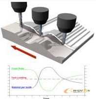使用PS-Optifeed优化F值,系统可以根据生成刀具路径在切削时的切削量的变化,自动进行速度优化处理,也就是说在切削量小的地方加快切削速度,而在加工余量大的地方增加切削速度,从而缩短加工时间,提高了工作效率,减少刀具的损坏,延长刀具的寿命,保证了机床和刀具需要的切削载荷的更小变化,提高精加工的表面质量,图13是优化F值的过程,图14是优化F值后,切削时切削速度根据余量的变化曲线
