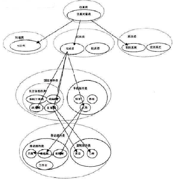 在数控车削仿真系统中,将各个对象的“共性”加以抽象,形成类。类的形成原则是所有类对象必需具有某种共性。类中分为虚类和实类。虚类通常为类对象中的最高的类,具有最通用的一些特性。但同时其参数也相对比较少,如果按照其构造对象,通常无法在视图中加以显示。因此常采用实类实现对象的构造,但虚类往往是实类的父类,一些参数而要从中定义。虚类和实类都可以有子类,不同的是,实类和其子类都可直接构造对象。父实类和了实类可以具有不同的下级类。类关系图见图2。  图2 数控仿真类关系图