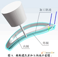 橡胶模粘合到木模上后,变形成为一个非球面,因此内外圈的加工轨迹不能用三轴方式规划,必须采用五轴加工方式规划加工轨迹(如图6)。橡胶模的内外圈侧面都是直纹面,理论上可一次加工成型。