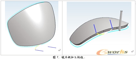 选用标准配置五轴加工机床,X、Y、Z三个平动轴,A、C两个转动轴。在大批量生产中,加工效率和质量尤为重要,加工中的进给速度和主轴转速都比较高,因此在加工中须特别注意散热,需要有高压气体吹冷并去除毛刺。经过木底模、橡胶模加工之后,合理选择进给速度和主轴转速,最后成功加工出一对镜片,如图9。实加工的边缘较为光滑,质量和精度都达到了要求。