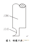 修圆加工工序将镜片边缘修圆,使得镜片的边缘光滑,便于成品安装到目标镜架中。一般使用刀具为R修圆刀(示意图如图8)。由于镜片材料受热时容易形成切削毛刺,因此在修圆加工中需一直用高压气体吹冷减少加工后的变形,并且不断去除切削废料。