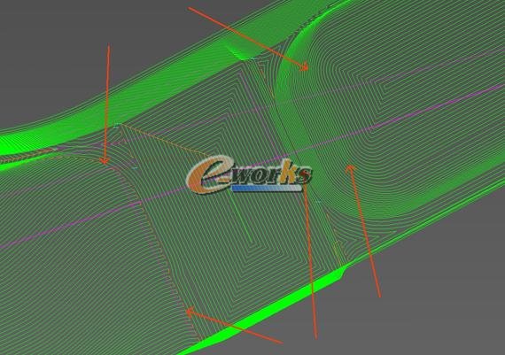 PM软件型腔的陡峭区域和平缓区域刀轨的连接处图例: