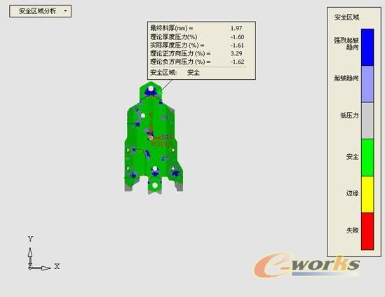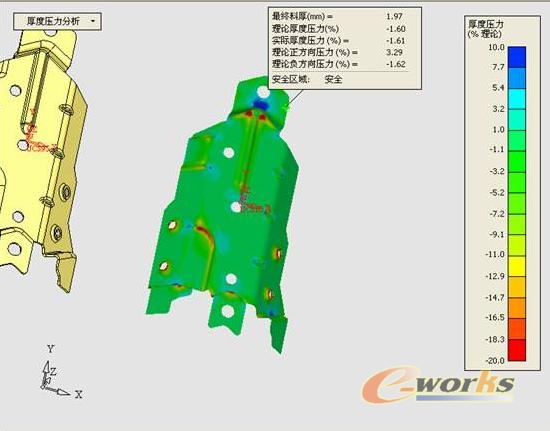 (4)、对零件冲压成型时的有限元分析,观察其厚向压应力和安全区域分析的具体情况。如下图所示。这样就可以直观看到冲压零件在成型中容易起皱和拉破的位置。以方便我们在设计中能采取一些工艺上的措施解决。