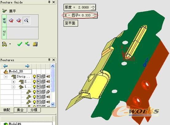 (5)、进行对冲压零件的分析后,接着把这个零件的冲压成型过程进行钣金反求,以合理安排冲压零件的工位设计。添加一个工位模型,然后进行展开和折弯等工序。在进行折弯和展开时,根据所使用的材料而定义其最小弯曲半径以及中性层系数等。这样就能够保证在冲压时发生的变形计算。