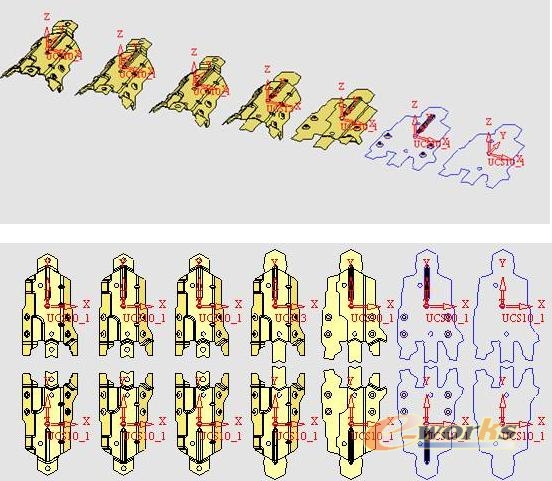 (6)、通过一系列展平,折弯等的工序,得出整个零件的冲压成型的工位,以及展开的最大轮廓尺寸。为了提高工作效率,设计成为两行工位。