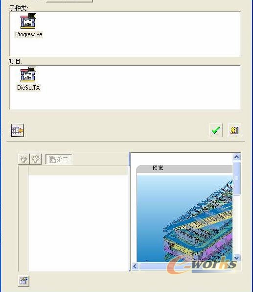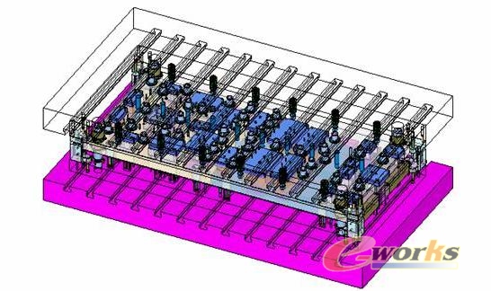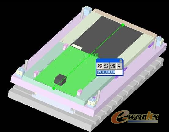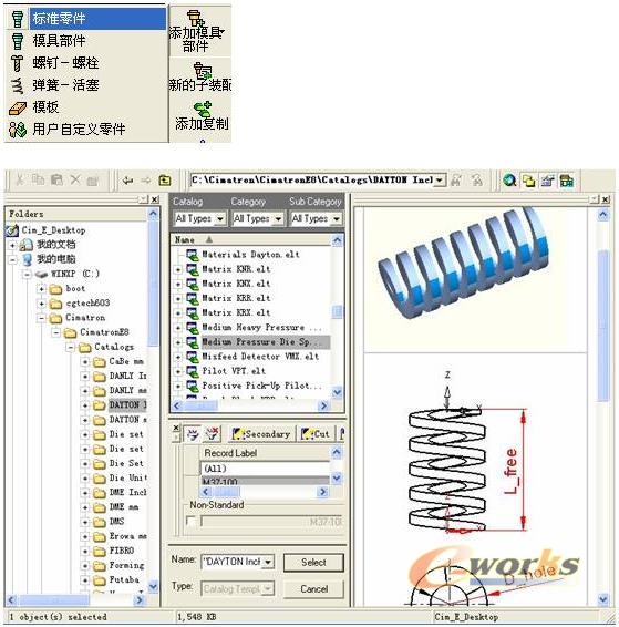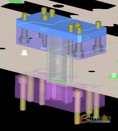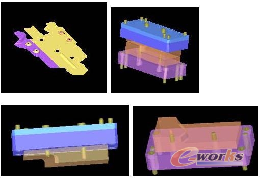 3、模具设计。 Cimatron 拥有丰富的模架系统,能够直接调入标准模架以及相关的标准件,例如定位销,弹簧,导柱等。假如在后续的出工程图纸以及工程变更的工作,大大提高效率。