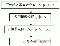根据输入的数据计算出绘制图形所需的参数,利用这些参数确定三维的点和向量,经运算得出绘图所需的三维点。运行程序时首先要输入有关参数变量,如两个圆管的半径、倾斜角度、偏心距。包括曲线β和θ自变量的初始值、终值和步长dβ和dθ接着输入曲线的函数方程x(θ)、y(θ)、z(θ)。然后程序便自动按dβ和dθ自变量,求出相应曲线上各节点的坐标,将各节点用直线连接。曲线绘完后可以转换为DXF格式的文件。流程如下: