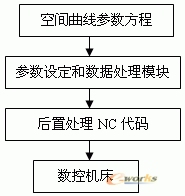 参数设定和运算模块采用图形人机对话的方式输入空间曲线的几何参数和工艺参数,除了基本参数以外还有机床设定和刀具设定。系统为每一个参数数据设计了存储单元,用规定的格式保存,得到图形数据文件和工艺描述文件。并且将输入的参数运算处理为实际加工空间相贯线所需要的符合G代码插补指令的NC图形数据。再根据加工精度,设定加工步长,离散化曲线数据点,得到最终的符合G代码指令的图形数据。再由切割机床数控系统的加工数据格式给出了具体的数控代码接口程序。即由NC图形数据得到加工相贯线的数控加工程序。送入机床加工。系统结构框图如下: