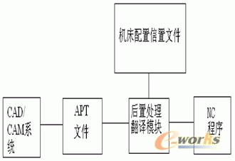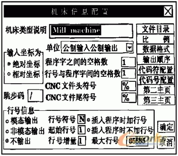 通过一个机床配置信置文件来对机床进行描述,并用这个描述来控制后置处理的模块。使用这个后置处理翻译模块便可以将由CAD/CAM系统产生的APT文件翻译成可执行的NC程序。机床配置信置文件的取得一般是通过回答用户对话框。这种对话框通常会需要用户对机床的一些特性进行描述,以此获得所需的信息来构成翻译模块。