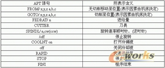 APT文件中并不包含一般机床所用的G代码或是M代码,而是用GOTO、STOP等语句来描述机床的动作,后置处理的译码既是将这些一般性语句改成专门的机床运动语句。下面是一些APT中的常用语句所代表的含义。读者可以根据机床的语法来对应相应的描述。