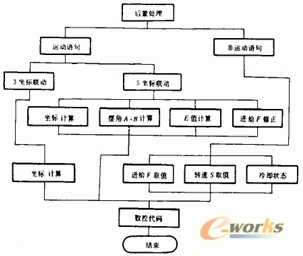 这是[4]中给出的一个后置处理过程图,其进行了由大型商用软件Catia所产生的APT文件到MACS5000五坐标数控龙门铣床数控程序的后置处理文件的编写。从过程上看,后置处理分为运动语句的后置处理与非运动语句的后置处理两部分,运动语句的处理主要是位置因素的计算,而非运动语句则是APT语句到NC代码语句的转化。这个流程图代表了一般后置处理的过程。