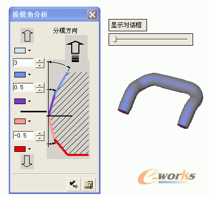 步骤三、检测拔模角,Cimatron允许设计者随时检测拔模角,并以不同的颜色显示拔模角的大小,红色表示负拔模。观察分模面有没有倒拔模,没有继续下一步。