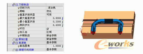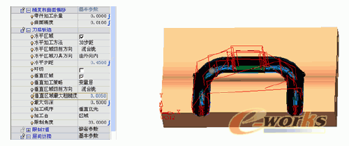 分模面精加工策略选择曲面铣、根据角度精铣,使用这种策略系统会自动查找平缓区域和垂直区域,不同的区域采取不同的加工策略,直到满足图纸要求为止,刀具选择φ16R4环刀。设置参数及刀路轨迹如下: