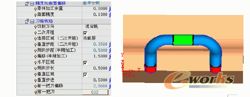 步骤五、清根设计。加工策略选择局部精细加工、清根铣。刀具选择φ6球刀,由于与前一把刀具直径φ12相差大一些,系统会采取二次开粗保护刀具。设置参数及刀路轨迹如下: