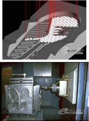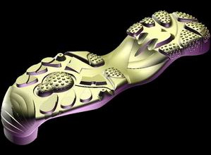 Cimatron 以其强大的模具设计功能和加工功能缩短了设计制造时间,这在模型和铝模生产和加工中起了决定的因素,制造过程及其复杂必须为不同鞋底和不同尺寸制定专门的宏,Cimatron的3D模块能够自动的创建截面图,并进行调整,在精度和速度方面这是其它CAD/CAM软件无法比拟的,我们拥有5轴加工中心可用来制造复杂的零件,这些零件一般由工业界享有声誉的设计者如 :Prada 等设计,他们是由皮革及其它的材料粘结而成,而铝模非常复杂。