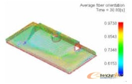 按照上述工艺条件,对制件的填充和保压过程进行了分析,得到的与纤维增强有关的部分模拟结果如图2所示。