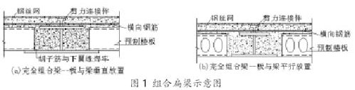 组合扁梁楼盖由钢梁和预制钢筋混凝土空心楼板组成,其中预制钢筋混凝土楼板搭在钢梁的下翼缘上。加配横向钢筋和钢丝网是为了保证在扁梁达到强度极限状态之前不发生混凝土板纵向剪切破坏,剪力连接件是保证剪力有效地传递及叠合板共同工作。