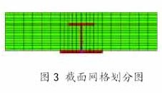 所有的实体单元均为8 节点的长方块,主要处于以下两个原因:(1)单元的形状过于奇异(如存在太大或太小的内角等)会影响计算结果的精确度,采用映射网格,各个单元均为长方块可以提高计算精度,以较少的单元获得比较满意的结果。(2)每个单元均为长方块,便于分层,这样模拟混凝土开裂的效果比较自由网格的三角形单元要好的多,也更接近实际情况。划分好以后,采用“Merge”或“Glue”等命令把模型各部分连成空间的一个整体,保证单元之间的位移协调。对于试验研究的组合扁梁在高度方向共分17 层,上下翼缘各分2 层,长度方向每100mm 分1 段。截面的单元划分见图3,建好的模型如图4~图6。加载采用位移加载方式,即在加载点施加足够大的位移,直到构件完全破坏,其约束条件的设置和试验完全相同。计算时,对所施加的外荷载和特征点挠度进行跟踪。