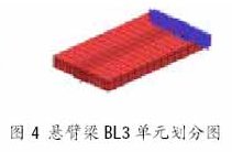 简支、悬臂和两端固支三种不同边界条件的组合扁梁跨度分别为4000mm、4000mm 和1500mm,对其分别建立了ANSYS 有限元模型,并进行了计算分析。在有限元分析中,假定钢材各向同性,弹性模量取188673.3MPa,泊松比取0.3,质量密度取7850kg/m3。在材料非线性分析中,采用目前非线性分析中常用的Von Mises 等向强化准则,钢材本构关系取双直线模型,即初始弹性模量取188673.3MPa,进入塑性强化阶段切线模量取750MPa,钢材屈服强度取397.75MPa;钢筋取理想弹塑性模型,初始弹性模量取2E5,进入塑性强化阶段切线模量取0;BL1、BL2 和BL3 梁的混凝土的压溃强度分别为37.7、47.2 和41.3MPa。以上数据均与试验的标准试样的测得数据相吻合。