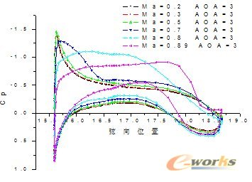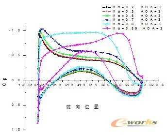 图8 站位2处不同状态下的压力分布  图9 站位3处不同状态下的压力分布  图10 不同状态下不同马赫数机翼剖面上的升力系数  图11 CFX-5.6计算的阻力系数和风洞试验结果比较 |