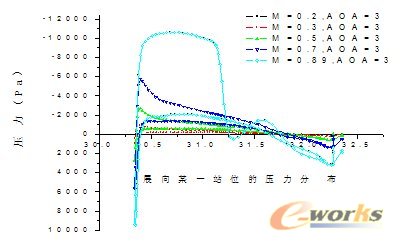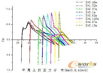 从图12和图13中,我们也很容易得到平尾上的压力分布规律,与机翼类似,在马赫数为0.89时,平尾上也出现了很明显的激波。