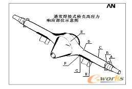 根据该车后桥结构特点,有限元分析的重点集中于桥壳分析,即将车桥主要受力简化成桥壳受力,该简化计算模型基本反映出车桥的应力集中以及局部应力分布及水平,能满足实际设计分析的要求。该车桥主要由后桥壳、加强板、平衡杆支架、板簧支座等组成,为钢板焊接式,一般其强度问题点发生的部位如图1所示。在最主要的垂直载荷工作条件下,桥内侧承受等弯矩,平直管区的名义应力响应最高,其中C、D、F点有弹簧座或过度圆弧产生应力集中效应而成为高应力区域。实际车辆上,平直管区还可能有减振器、平衡杆安装支架等,向桥壳加新的作用力或因支座对桥壳产生约束而产生应力集中,G、H点是平衡杆座板焊接位的应力集中问题, E点处在中间相对平缓的过度部位,应力也较高,A、B点的高应力对应最大侧向载荷工作情况发生。