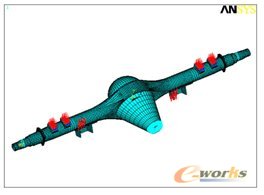 后桥所受载荷有后悬挂及后轮对后桥的作用力,本分析考虑了两种工作载荷:一种为桥负荷,取最大负荷为2.5吨(动载系数2.5),分别作用在板簧支座与桥壳联接位,如图3所示;另一种载荷为平衡杆在车身发生倾斜等情况时产生的抗力。
