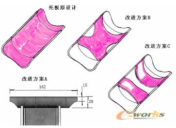 综合分析支座板结构,设计三个改进方案都去掉原设计中向外沿伸的“耳字形”托板,考虑到:车身侧倾一方,平衡杆对桥壳是下拉作用,托板不起力传递作用;另一侧,虽是上推作用,它与主载荷是相减的。同时因制造平衡杆支座高应力分布等因素,对桥壳的托起作用也明确。更主要的是因为它使得支座板刚度加大,令焊缝端点处于“凹口”状态,增加了焊缝端点的应力集中度。出于同样理由,各改进方案都将支座板两端中部剪为内凹入形,使得焊缝端点处于“稍尖”状态,减少焊缝端点应力集中。
