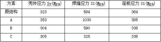 从结果可见,方案A效果不好,焊缝长度没改变,主要是焊缝下移后,离开了桥壳弯曲中心面,比弯曲中心大的桥壳轴方向延伸变形受到约束,造成轴方向约束力加大;方案B呈理想方向变化,但力度不够;方案C是较理想,壳体应力基本持平,Sv有所下降,焊缝S1有大幅度下降,但其位远离桥壳高应力部位。座板S1也呈下降态。所以从结构改进角度评价,不增加桥壳和支座板应力,同时降低焊缝高应力。