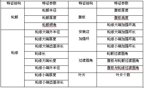 对于涡轴发动机组合压气机这种复杂的非标准件,我们首先对其进行结构分解,可分为轴流轮盘、轴流叶片、离心轮盘、离心大小叶片。我们知道叶盘结构非常复杂,在定义几何参数时具有一定的难度,这样我们引入了特征结构的概念,按特征结构对其定义参数。对叶盘结构进行特征分析,各种形式的轮盘都具有轮缘、腹板和轮毂三大基本特征,称之为基盘,其余形状则为辅助特征包括突缘、鼓筒、轴径、安装边、均布孔或安装孔、环槽及篦齿等[7]。基于这种思想我们对某轴流叶盘结构进行研究(图1),在满足分析要求的条件下,对结构进行适当简化并提取结构的几何参数(表1)。