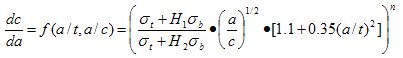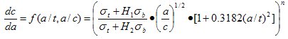 当初始裂纹形状比、相对深度和裂纹扩展的材料常数已知时,由上式可求得各种载荷下裂纹形状变化规律。对式(2.7)的数值积分结果得到 a/c和a/t 之间的关系,于是式(2.4)的应力强度因子K就仅是a/t 的函数,对于式