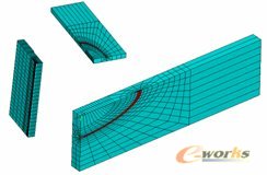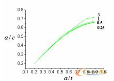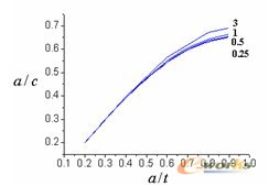 为了达到较好的计算精度,必须选择一个合理的疲劳裂纹深度方向扩展增量,这也是本文与其他一些方法不同之处。图2是通过ANSYS软件建立裂纹体平板模型,其中裂纹前缘采用1/4节点等参退化奇异单元。通过此模型讨论了在 、 的等幅拉伸循环载荷下,表面裂纹深度方向扩展增量 =3、1、0.5和0.25mm时,对裂纹形状变换规律的影响。