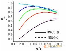 值, a/c的极限值不同,但有相同的变化趋势;裂纹扩展过程中a/c 的比值不再保持为常数;随着裂纹的扩展过程而不断发生变化,变化的最终趋于初始条件为