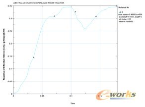 另外半挂车在使用过程中还有独特的甩挂工况,即半挂车从牵引车卸下时落地冲击工况。图3为使用LS-DYNA对某型半挂车甩挂冲击工况的模拟,可以看到,大梁在支腿连接部受到的瞬时冲击应力是非常大的,需要引起足够的重视。