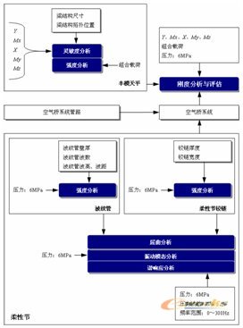 因为波纹管作为一种能自由伸缩的弹性补偿元件,具有工作可靠、性能良好、结构紧凑、刚度小等优点,故波纹管是空气桥设计必须的结构,但其设计不同于常规用途使用的波纹管,要求:①波纹管工作压力高(6MPa),②波纹管具有较小的横向弯曲刚度。而广泛用于石油化工、冶金、电力、核能、造船、管道工程等部门的波纹管,其工作压力通常小于2MPa,刚度计算仅考虑强度和轴向拉压刚度,其计算通常采美国EJMA规范、德国AD规范、前苏联维赫曼公式等,将波纹管简化为梁、曲杆或环板,计算结果存在较大的误差。波纹管的横向弯曲刚度方面的计算与测量几乎是一片空白,压力对波纹管刚度影响的分析与测量方面的技术研究也比较薄弱。
