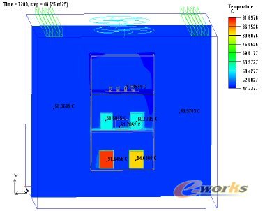 (1) 通过对试件结构、物理特性、电器特性的精确测算,进行准确的建模,给出恰当的初边值条件,灵活运用划分网格的方法和技术,在重要部位(如温度梯度高的位置等)进行局部加密,在不规则形状处采用非结构化网格等,就能准确地仿真出试件在试验箱内热平衡后温度分布情况,还能得到热流密度、速度、压力等云图。