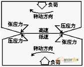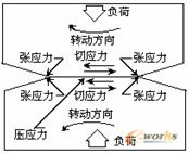 齿轮相互啮合传动过程中,轮齿间产生滚动和滑动运动。轮齿表面和次表面金属承受拉伸、压缩和剪切应力这些应力用图1表示。在啮合传动过程中,轮齿表面承受不同形式应力作用,齿面和近表面金属在拉伸、压缩和剪切应力作用下,经多次重复应力作用,齿面和近表面金属可能产生微小裂纹形成疲劳源,随之应力循环次数增加,裂纹将扩展以致相互连接起来形成小块金属脱落,齿面出现点蚀剥落,齿轮齿面产生疲劳损坏。对断齿疲劳源附近取样作材料分析,结果表明,点蚀齿面近表面金属有多条疲劳裂纹,疲劳裂纹方向与表面呈45o。金相检查发现渗碳层组织粗大,无粒状碳氮化合物,残余奥氏体较多。齿面硬度偏低(HRC56),促使齿轮抗接触疲劳性能降低。在重复应力作用下,经过高周次接触应力循环作用,微裂纹扩展及聚合。导致轮齿断裂。