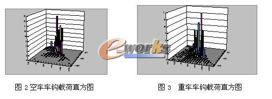 选用AAR标准中的90.7吨高边敞车载荷谱。经计算比较,车钩力是引起疲劳破坏的主要原因,因此,空重车动应力计算采用90.7吨高边敞车空车车钩载荷谱及满载车钩载荷谱,下图为上述载荷谱的三维雨流计数后的直方图: