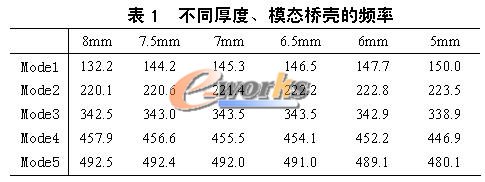 改变桥壳本体厚度做模态分析,结果如表1所示。