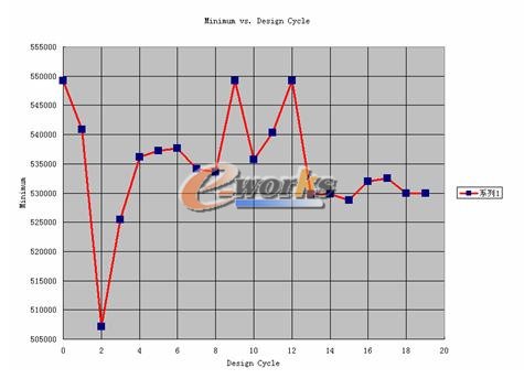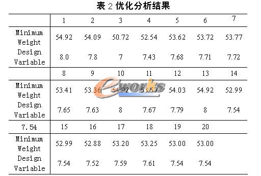 以重量最小化为定义目标,定义约束为许可应力。把桥壳的厚度定为设计变量,其最大值定为8mm,最小值定为6mm。表2为经过20次迭代后的结果。
