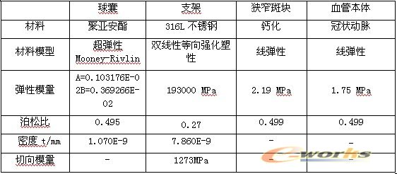 对于支架本体采用双线性等向强化弹塑性模型描述奥氏体316L医用不锈钢支架的材料;分析用球囊采用Johnson公司2.0mm规格的RAPTORRAIL球囊,其材料为聚亚安酯。对于血管的材料模型,将血管看成各向同性的弹性管,但是狭窄血管的弹性模型与泊松比根据国外最新研究成果[4]选取。综上所述,将支架、球囊和血管的材料模型汇总,如表2所示。