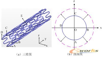 在对支架施加约束条件时,必须确保支架在发生大变形扩张整个过程中都是适合的,合理的约束条件是支架扩张变形模拟的关键之一。在建模时选笛卡儿坐标系的y轴为支架轴心,则支架的约束条件为:对支架上平行于yz平面和xy平面的所有节点施加对称约束,即位于该对称约束平面上的节点只能在该平面内运动,而不能沿垂直于该平面的方向运动;对支架轴向中心处的所有节点施加轴向y方向约束,即支架中心处所有节点只能沿径向运动,不能沿轴向y方向运动,而支架末端不施加约束,可沿径向和轴向自由伸缩,约束条件如图6所示。球囊和狭窄血管的约束条件与支架类似,有一点不同就是除在其对称面施加对称约束外,需要将球囊和血管本体的末端完全固定。