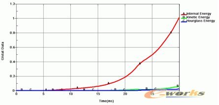 采用动力显式算法模拟支架耦合扩张变形这类准静态过程时,提高虚拟球囊加压速度有利于提高计算效率,为保证计算精度,提高虚拟球囊加压速度应同时满足以下两个准则:①动能与内能的比值<5%;②沙漏能与内能的比值<5%。作者将仿真计算结果与实验数据进行比较,验证了该准则的合理性,并将该准则用于本文的支架耦合扩张变形动态仿真分析中,支架耦合扩张动力显式分析的系统能量变化曲线如图8所示。