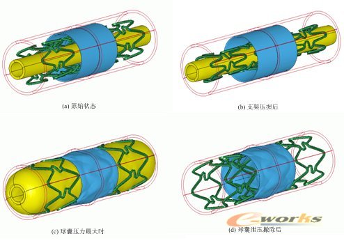 图9 支架耦合扩张过程变形结果(血管本体显示为线框图)