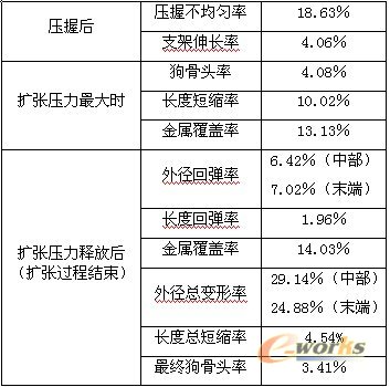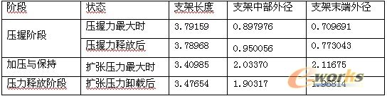 为便于比较,将支架扩张各阶段的变形结果以及计算得到的比率值分别见表3和表4。