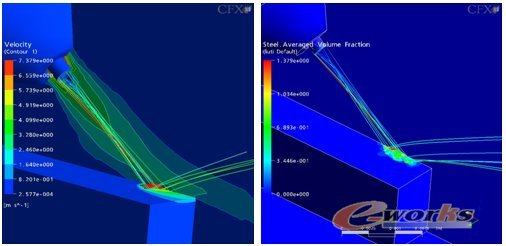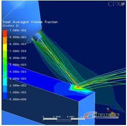 在CFX中计算气粉两相流外流场,熔覆层表面气/粉两相流场及平均体积分数分布如图8所示: