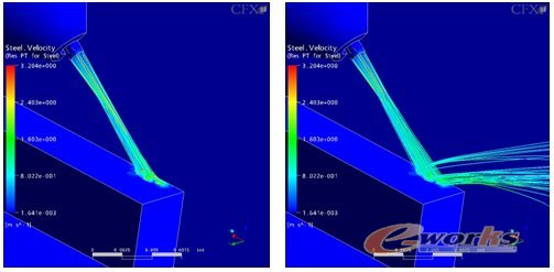 由图可见:首先粉末随载粉气体到达喷嘴并在重力作用下从出粉口下落,在重力及约束气流的带动下加速下落形成气/粉两相流,并在工件表面上形成近似椭圆质量分布,由于工件表面未熔化,此时粉末颗粒全部反弹,没有熔覆层形成。