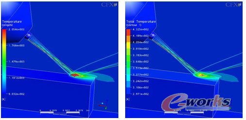 基于固体颗粒撞到固体表面就会反弹而撞入液态熔池就会被吸收的假设和该处粉末的体积分数分布,可得在时间步内是否激活单元使其成为熔覆层,图7 a为单元生死模拟熔覆表面,而图7 b为通过界面重构及重新温度插值,将ANSYS模型转换到CFX中。