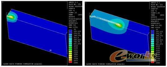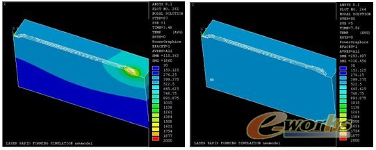 根据激光成形进入准稳态时的粉斑分布、得粉率及换热边界条件,在ANSYS中计算激光成形温度场及熔覆层生长如图11所示: